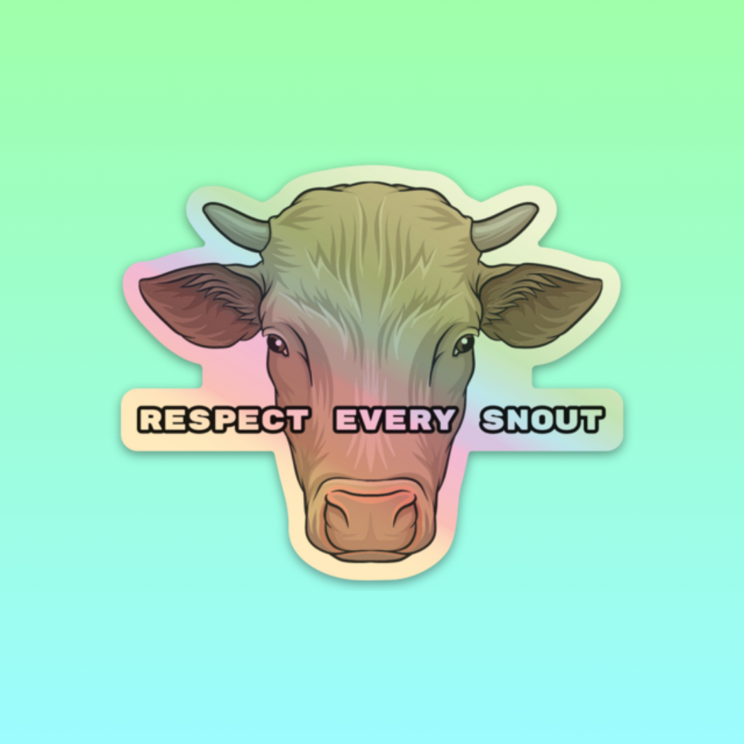 Show your love for cows and support of animal rights with this Respect Every Snout Cow Holographic Sticker. This eye-catching sticker adds some fun flair that's sure to turn heads. Show your support; spread the message and Respect Every Snout!
