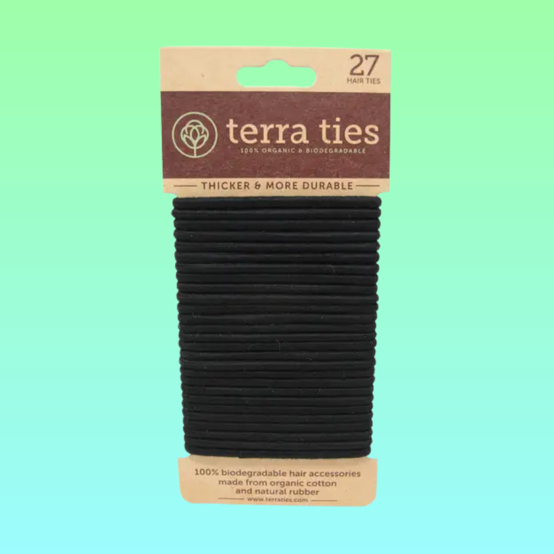 100% organic + biodegradable hair tie. Terra ties are plastic-free, 100% biodegradable hair ties. Unlike standard hair ties that are made of synthetic rubber and polyester, terra ties are made from natural rubber and organic cotton. In addition to being 100% biodegradable and having packaging made from recycled materials, terra ties, which come in packs of 27 hair ties, are softer, thicker, and more durable than standard hair ties. Available in black. One size fits all.